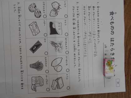 5月28日 外部の栄養の先生に来ていただき食育の授業を受けました。食べ物の3つのはたらきを学びました。イメージで覚えることができるように、緑・赤・黄色の食べ物に分けました。