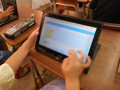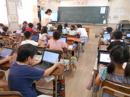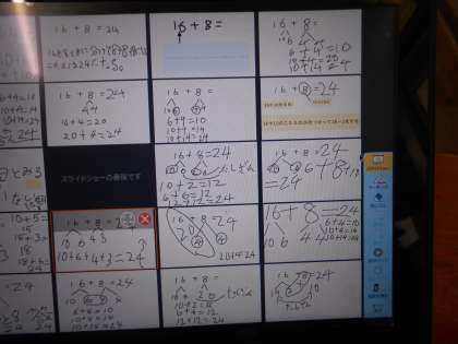 7月14日 算数で2けた+1けたの計算をどのように考えれば暗算ができるか学習しています。16+8について、タブレットに自分の考えを入力しました。その考えがみんなのタブレットに反映されるので、同時にクラスメートの考えも見ることができます。人の考えを知り自分の考えと同じところ、違うところを確認し学びを深めました。