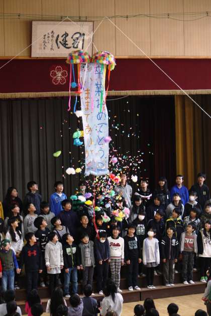 在校生から各班の6年生にメッセージボードのプレゼントがあり、6年生からは手作りのぞうきんと在校生へのメッセージ、歌のプレゼントがありました。