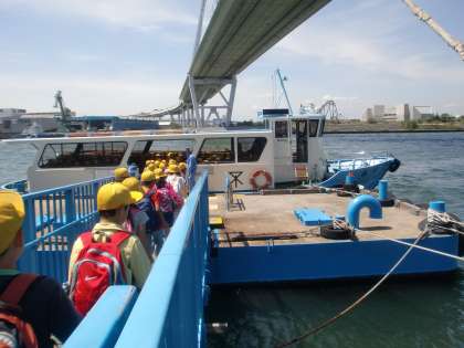 見学・お弁当の後、さわやかな青空の下、天保山から桜島へ渡船でのミニクルーズを楽しみました。