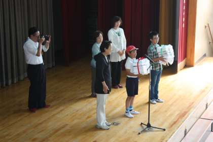 今日の児童朝会で、ぞうきんの贈呈式が行われました。