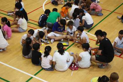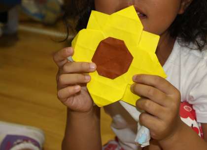 大きな色紙を使ってみんなに、ひまわりの作り方を教えてくれました。