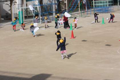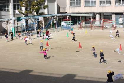 1年生が運動場でたこあげをしました。