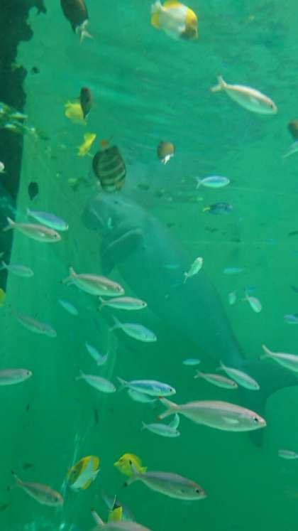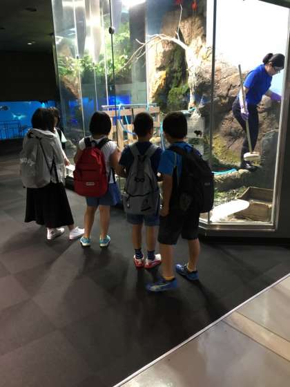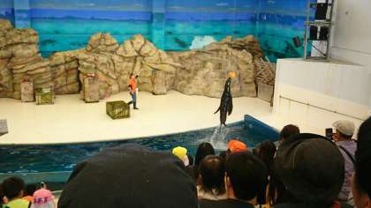 色とりどりの魚たち、アシカのパフォーマンス、飼育の様子など水族館を楽しんでいます。