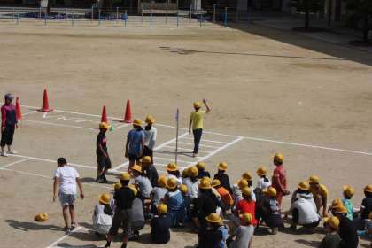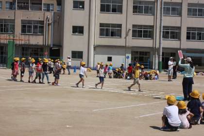 運動場の模擬道路を使って、学年ごとに交通安全の学習をしました。