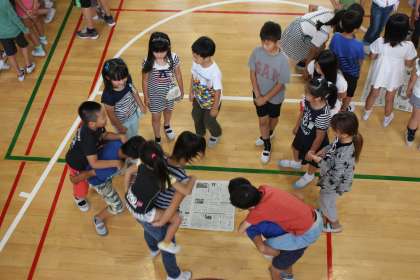 新聞紙を島に見立てて、班の全員がその上に乗ることができれば、ミッション成功です。