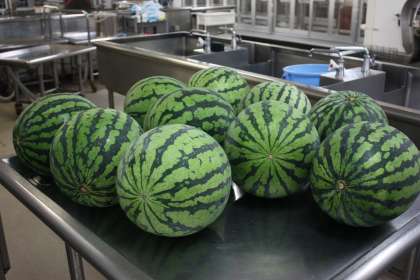 今日の給食のすいかは、学校で給食調理員さんが切りました。