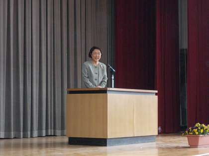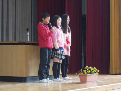 児童会の代表の5年生が、1年間のふりかえりや春休みの計画などについて発表しました。