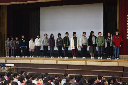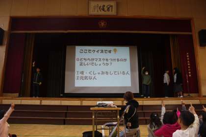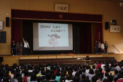 児童集会で、健康委員会の5・6年生が体と歯の健康について発表しました。