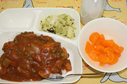 給食のハヤシライスは、給食料理員さんがルーから手作りしています。