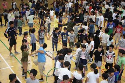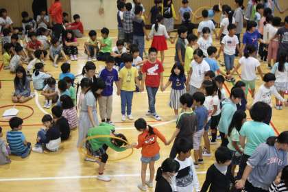 5月に編成したたてわり班で、フラフープ送りをしました。