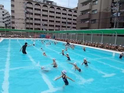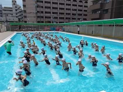 音楽に合わせて行うプールの中での水なれや、水遊びを楽しみました。