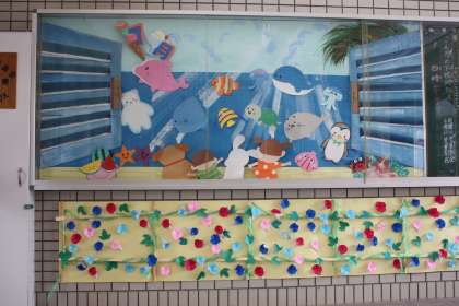 行事黒板の季節の掲示と共に夏らしさを演出しています。