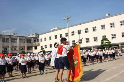 仲よく、紅組と白組の応援団長が校長先生から優勝旗を受け取りました。
