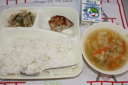 給食でおなじみのマヨネーズ焼きですが、今日はを卵不使用のドレッシングでかつおをマリネして焼き上げました。