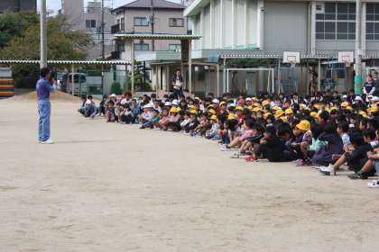 戸締りをした教室で待機し、不審者が確保された後、運動場に集合し警察やセーフティよどがわの方から、緊急時の心構えや行動についてのお話を聞きました。