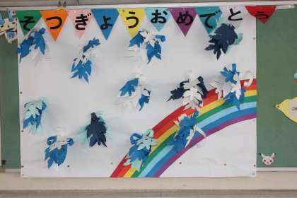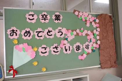 校内の掲示板には、6年生へのメッセージが掲示され、お祝いムードが高まっています。