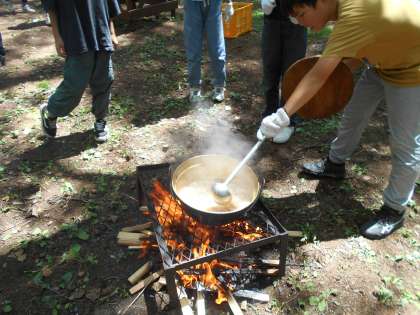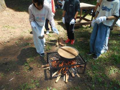 火の近くはとても熱いですが、鍋にルーを入れかきまわしました。