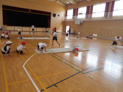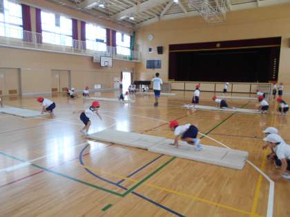 9月11日 外部から体育指導を専門とする講師の方にきていただき、マット運動を教えてもらいました。