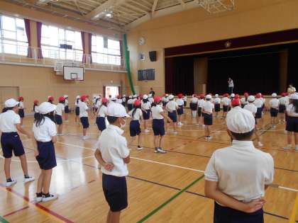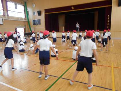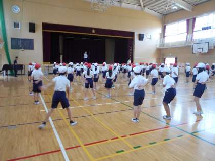 10月3日 体育で運動会の演技の練習をしています。移動のステップに取り組みました。