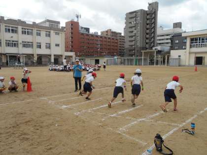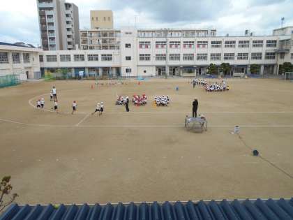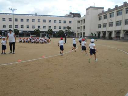 10月20日 体育で、運動会のときに走る練習をしました。入場や退場のしかた、走っている間の待ち方など教えてもらいました。