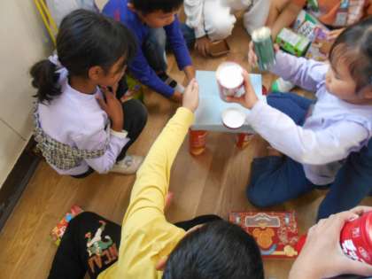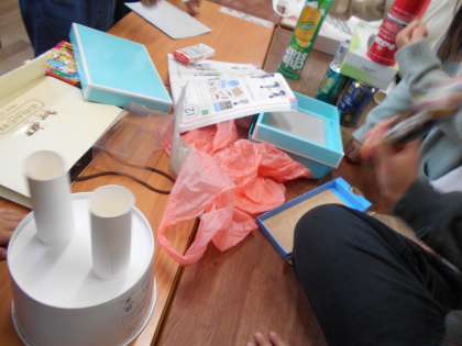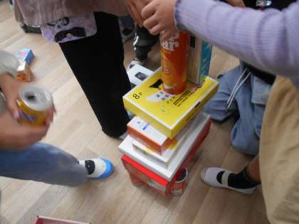 10月29日 算数で形について学習します。導入として各家庭から持ってきていただいたさまざまな箱を積んでいくという活動を通して、曲面や平面のちがいを体感します。