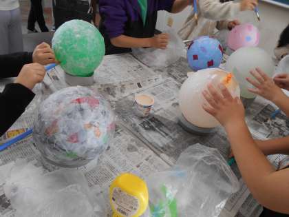 11月7日 図工でランプシェードの形を作りました。風船にちぎった紙をはっていきました。たくさんのりを使うので、教室が汚れないようにするために図工室で作業をしました。3年生全員で活動しました。
