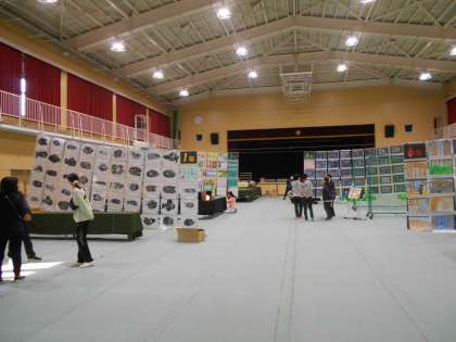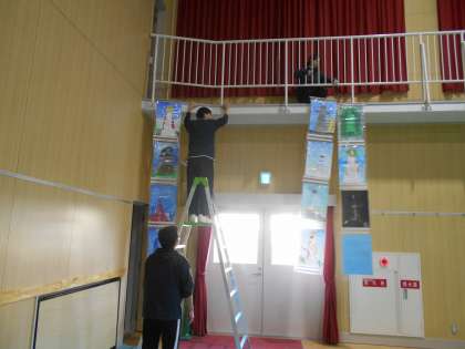 11月21日 児童下校後、体育館に絵をつったり、立体作品を置く場所を作ったりしました。来週の作品展を楽しみにしていてください。
