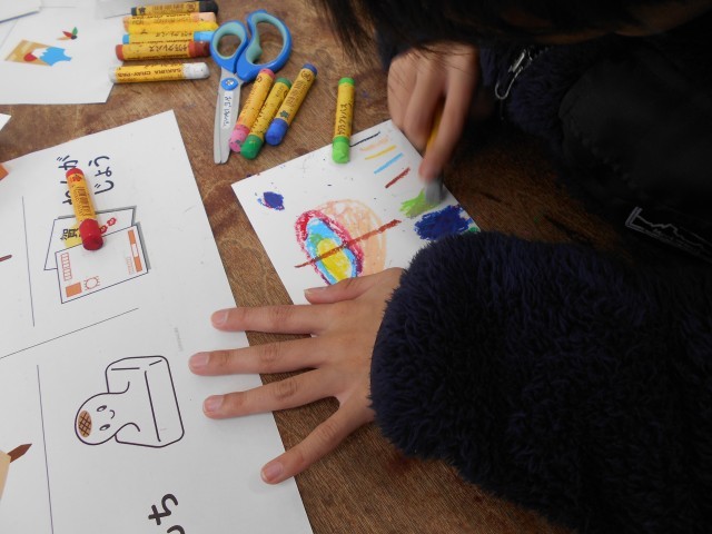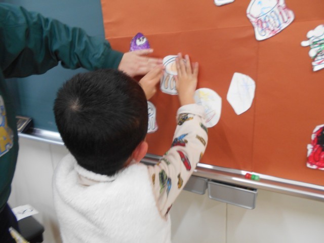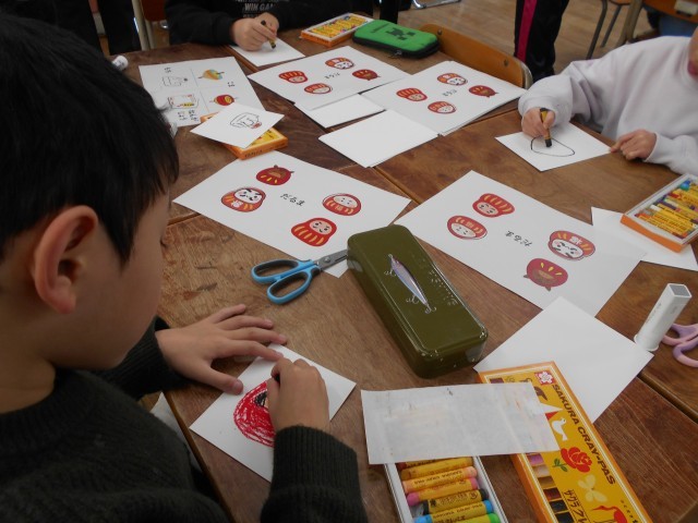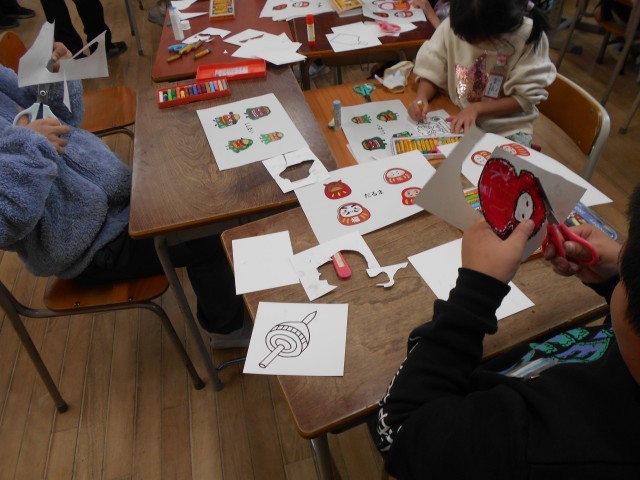 1月21日 なかよしタイムで正月をイメージした掲示物をみんなで作りました。絵をかいて切り抜きました。一人ひとりの絵で作品を完成させることができました。