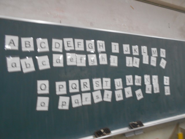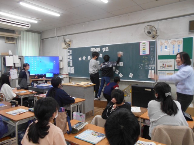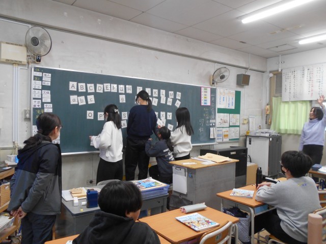 1月26日 小中連携の取組の一環として新北野中学校の英語の先生に来ていただき、出張授業を受けました。アルファベットの大文字、小文字の区別と注意点をさまざなま角度から教えていただきました。