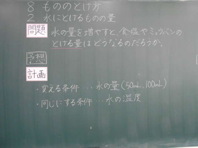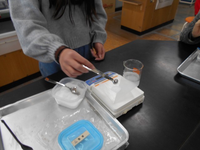 2月2日 理科でものの溶け方について学習しています。食塩とミョウバンを溶かすと、物質によって溶け方に違いがあるのか確かめました。今後、温度と水の量を変えながら様々な場合を確かめます。