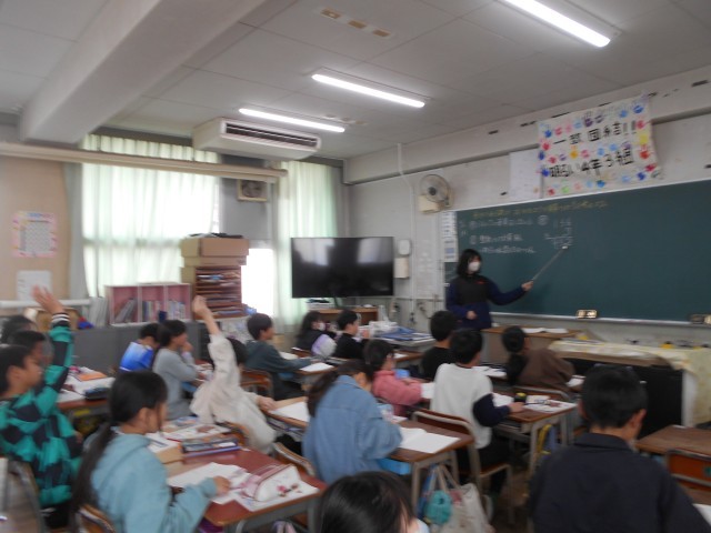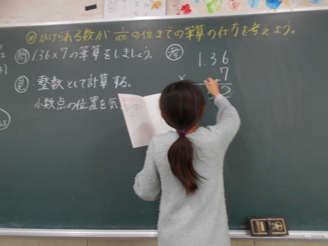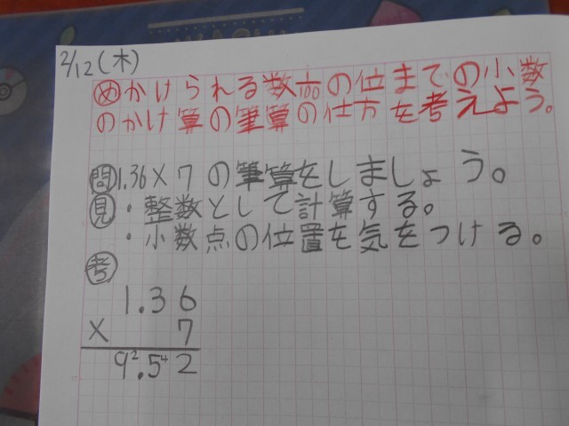 2月12日 算数で小数第2位の数のかけ算について学習しました。商の小数点をどこにうつのかを確認しました。