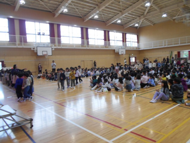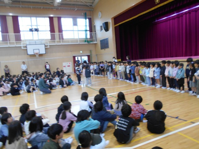 4月10日 1年生と2~6年生の対面式を行いました。1年生は2年生からあさがおの種をプレゼントしてもらいました。1年生には、はやく学校に慣れて、楽しい学校生活をおくってほしいと思います。
