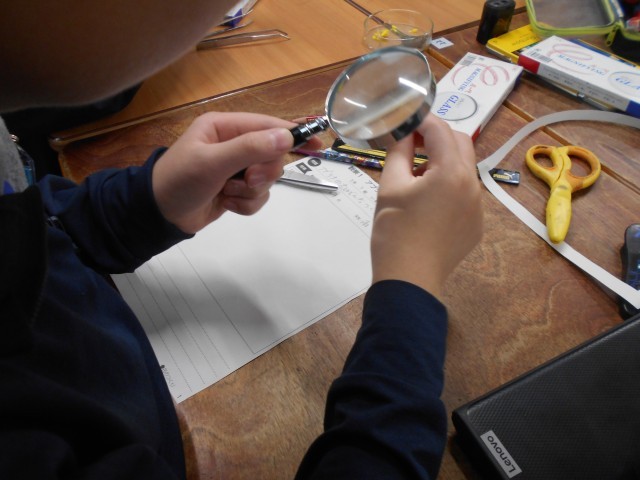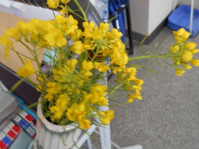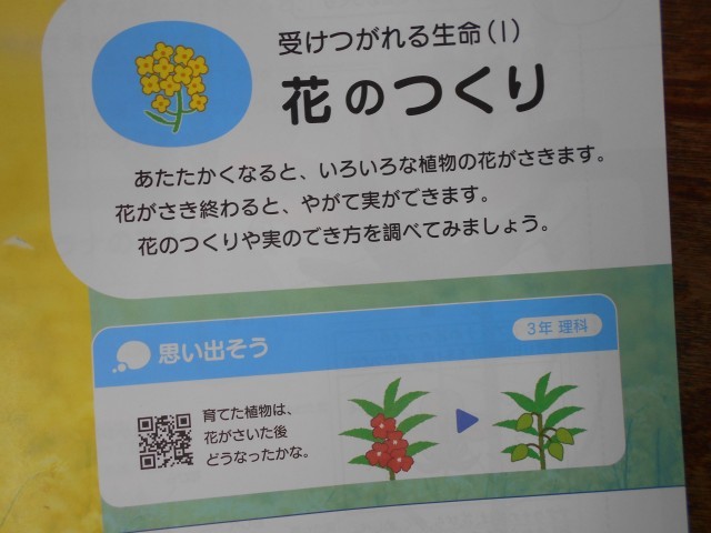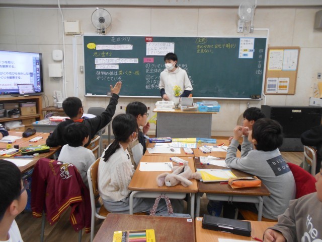 4月13日 理科で、花のつくりについて学習しました。アブラナ(菜の花)をはなびらやがく、おしべ、めしべにわけて観察しました。