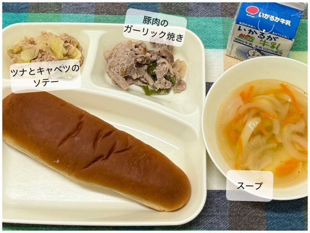今日の献立は、豚肉のガーリック焼き スープ ツナとキャベツのソテー 黒糖パン 牛乳です
