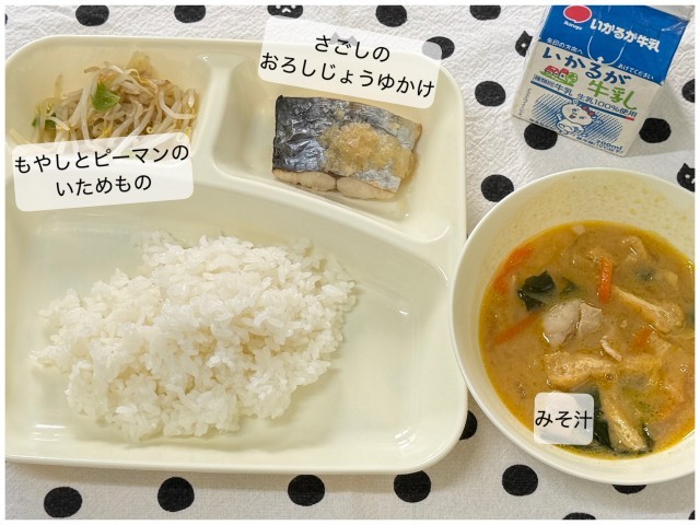 今日の献立は、さごし🐟のおろしじょうゆかけ みそ汁 もやしとピーマンのいためもの ごはん🍚 牛乳🥛です。