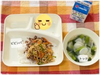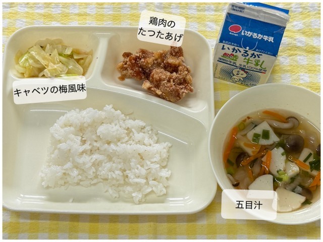 今日の献立は、鶏肉のたつたあげ 五目汁 キャベツの梅風味 ごはん🍚 牛乳🥛です。