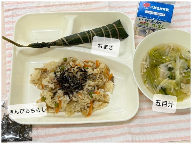 今日の献立は、きんぴらちらし 五目汁 ちまき 牛乳🥛です。