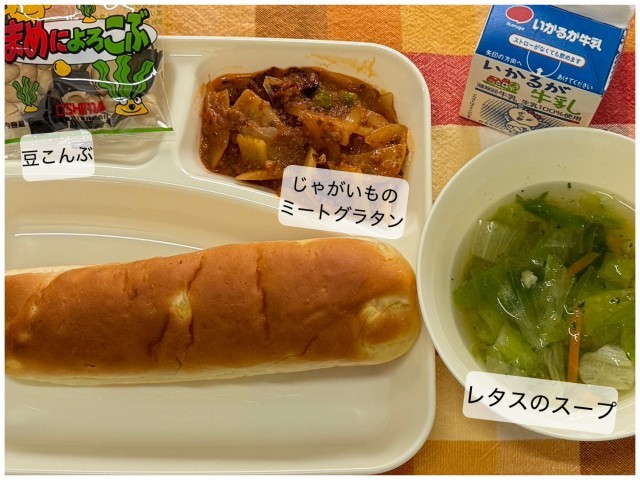 今日の献立は、じゃがいものミートグラタン レタスのスープ 豆こんぶ おさつパン🥖 牛乳🥛です。