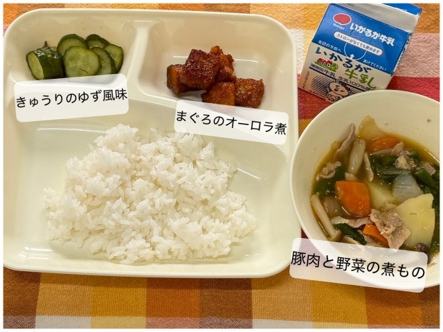 今日の献立は、まぐろのオーロラ煮 豚肉と野菜の煮もの きゅうり🥒のゆず風味 ごはん🍚 牛乳🥛です。