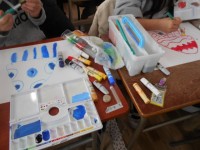 2月16日 図工でカラフルなクラゲを描いています。絵の具が混ざらないように境目に...