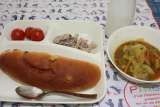 豚肉のオイスターソース焼き 糸寒天のスープ ピリ辛あえ 大型コッペパン ...