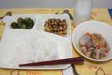 鶏肉と野菜のケチャップ煮 カリフラワーとコーンのサラダ 桃のクラフティ 黒...
