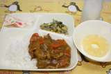 豚肉のしょうゆマヨネーズ焼き カレースープ プチトマト レーズンパン ...