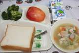 鶏肉と野菜の洋風煮 ブロッコリーのサラダ りんご 食パン マーガリン 牛...