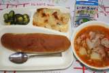 豚肉と野菜のケチャップ煮 きゅうりとコーンのサラダ 桃のクラフティ 黒糖パ...