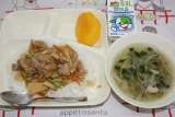 鶏肉のチリソース焼き とうふとワンタンの皮のスープ 中華いため 米飯 牛乳