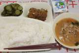 ピリ辛丼 中華スープ 黄桃(缶) 米飯 牛乳