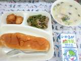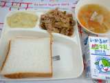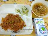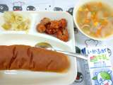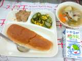 鶏肉のみそマリネ焼き スープ煮 きゅうりとコーンのサラダ おさつパン 牛乳 ※...