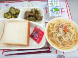 牛肉のカレー風味焼き トマトのスープスパゲッティ きゅうりのピクルス いちごジャ...
